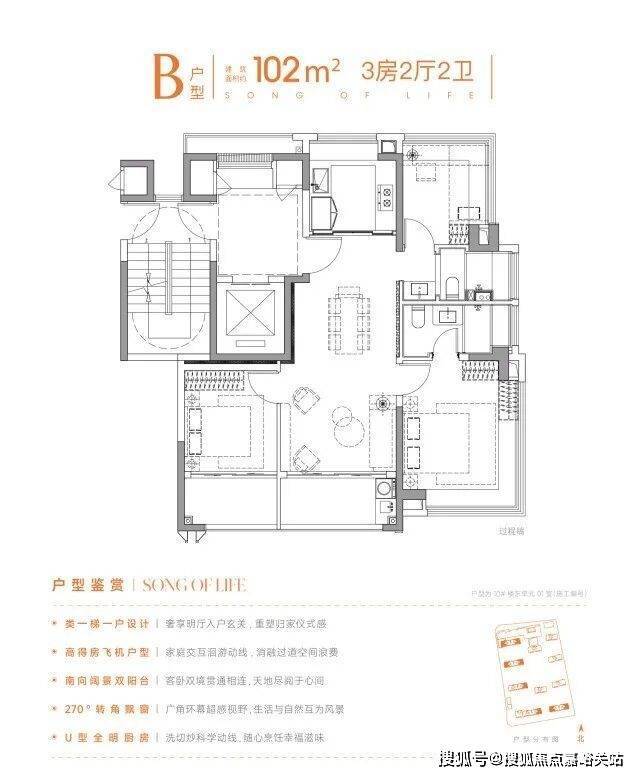 高得房率的飞机户型减少过道浪费,餐厅空间比同面积段户型更阔绰,家庭聚餐更显从容;双卫均带飘窗,洗漱时也能沐浴阳光;南北双270°环幕视野,通风采光俱佳,适合追求生活品质的年轻改善家庭。