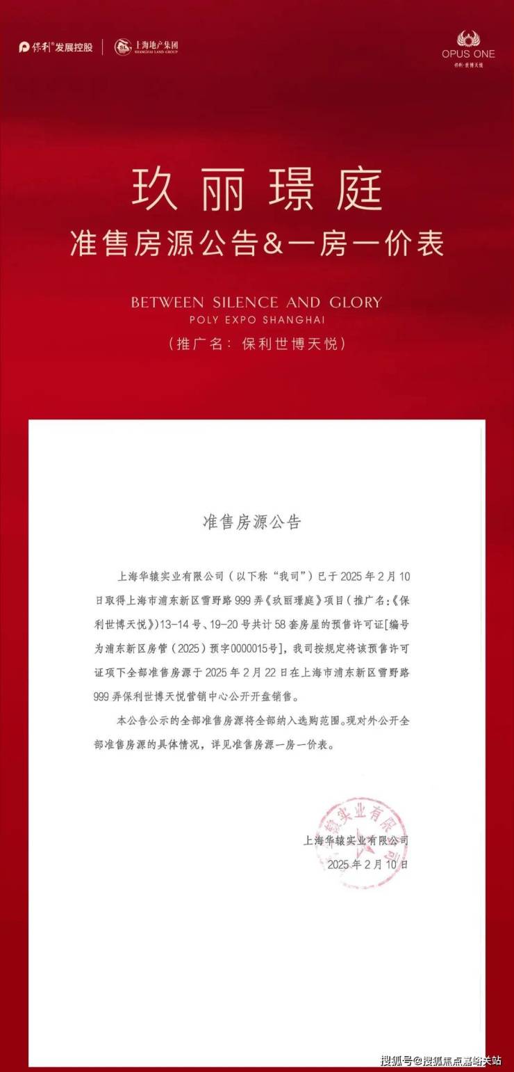 1、项目推广名为“保利·世博天悦”,地名核准名/备案名为“玖丽璟庭”,开发公司为: “上海华辕实业有限公司”;预售证号:浦东新区房管(2025)预字0000015号; 2、本资料为要约邀请,不作为要约或承诺;3、相关宣传内容不排除因政府相关规划、规定及出卖人分期规划、未能控制等原因而发生变化;4、买卖双方的权利义务以双方签订的商品房买卖合同及其补充协议、附件等书面文件为准;5、本宣传材料所涉及户型仅供示意参考,具体以政府部门最终审定的图纸和销售合同为准,本资料所涉及面积皆为预估面积,相同户型单位因楼栋、楼层、单元等差异,局部结构、形式、面积、装饰等可能有所不同,且预估面积与实际面积可能存在差异,面积最终以房管局测绘为准。户型图中装修、家具、电器等设备仅为示意,不属于交付内容和交付标准,实际部品的选型和房间空间尺寸根据户型情况,略有差异,以现场实际为准;6、本宣传资料中涉及的价格、折扣、付款方式等信息,因销售时间、户型楼栋、楼层、方位等不同有所差异,以双方签订的商品房买卖合同及其补充协议、附件等书面文件为准;7、本资料所发布的内容为2025年2月的信息,敬请留意最新资料。