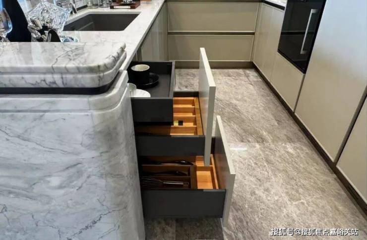 为使厨房成为「真正幸福之地」,璞元在各个细微之处倾注关怀,从地柜拉篮系统,到上柜系统,再到抽屉分格系统,浅抽与深抽搭配,让整个厨房空间,既百变,又充满秩序!