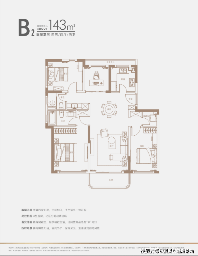 建面约140㎡四房:三开间朝南户型,南北通透,采光条件优质,客厅明亮宽敞,彰显大气布局。