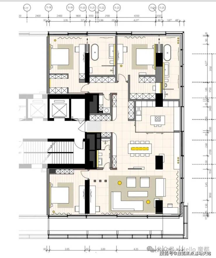 项目以德国包豪斯风格为建筑灵感,创新打造全落地玻璃墙高层住宅,由德国Obermeyer建筑设计事务所与德国Dibelius建筑事务所联袂设计。厚板框架建筑结构,开创了住宅自由定制户型的新模型(项目的科技系统都在地面或是顶棚,后期户型可以自己调整)