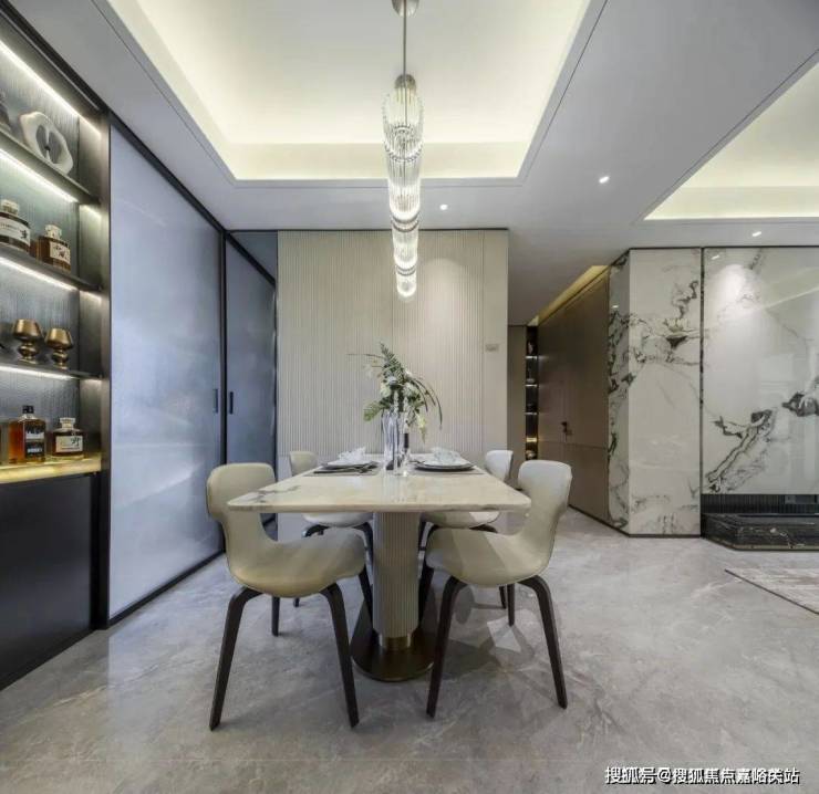 客餐厅一体化,南连同尺度宽景阳台,将生活的奢度打开。金茂定制壁布或墙纸交标结合 芬迪白岩板客厅背景墙,地面采用马可波罗(或同等品牌)大板砖,以定制设计感提升空间立体感。阳台外窗采用 大面积窗墙比,使得室内整体采光面、亮度、通风效果得到提升。
