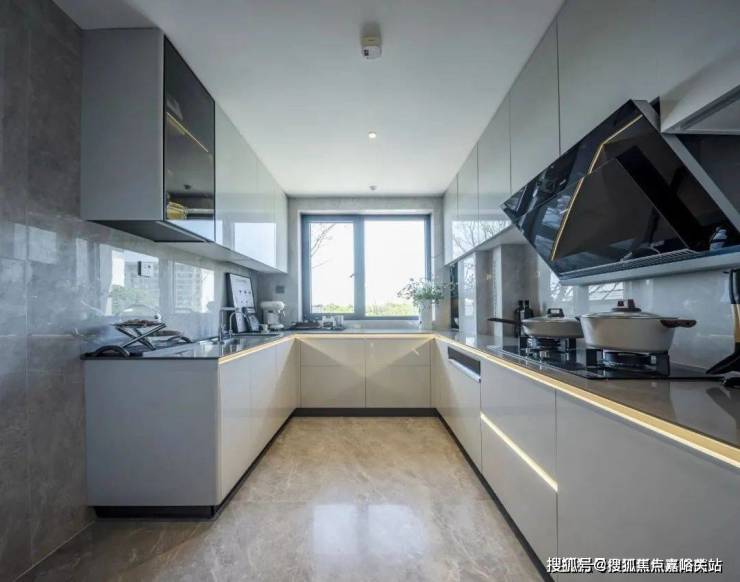 侧边可以做洗护功能区,放置洗衣机、烘干机、储藏柜收纳等。餐厅空间相当阔绰,可放置 四人桌或六人桌,尺度之大在600万级产品中非常难得一见。U型厨房带飘窗的设计,左侧预留了 双开门冰箱位置,让整个空间的利用率更高。交付标准相当奢豪华,配置 西门子的灶台、油烟机、洗碗机高配三件套,弗兰卡的水槽及抽拉式龙头,石英石台面,欧派定制柜柜体,部分金茂定制岩板的墙面等。双卫设计,避免早上洗漱的“排队”,充分体贴日常需求。