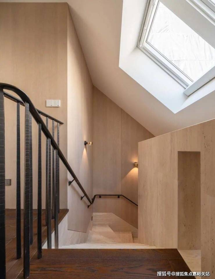 深铜色的栏杆和扶手融合传统与现代语汇,演变出一种当代型态,与现代白色洞石相映成趣,营造出优雅纯粹的意境。