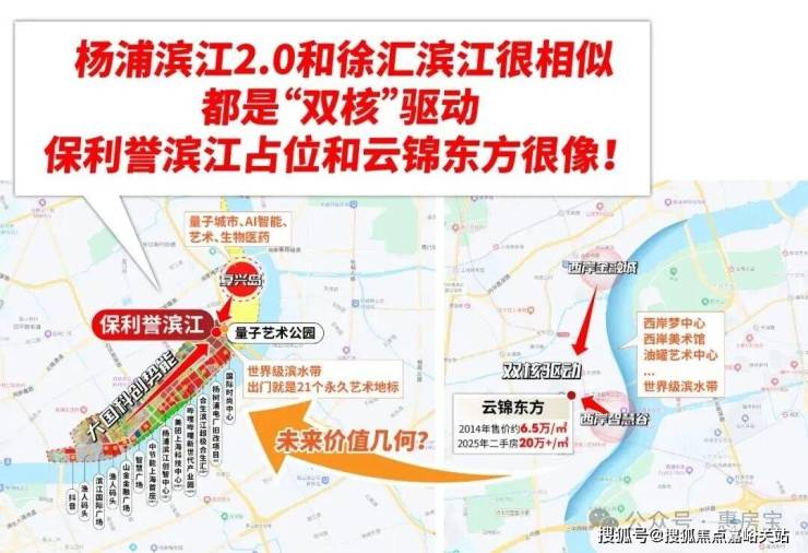 值得一提, 保利誉滨江在杨浦滨江2.0的位置,与云锦东方如出一辙——二者均处于“双核辐射的中心点”。你要知道云锦东方2014年售价约6.5万/㎡,如今已突破20万+/㎡。