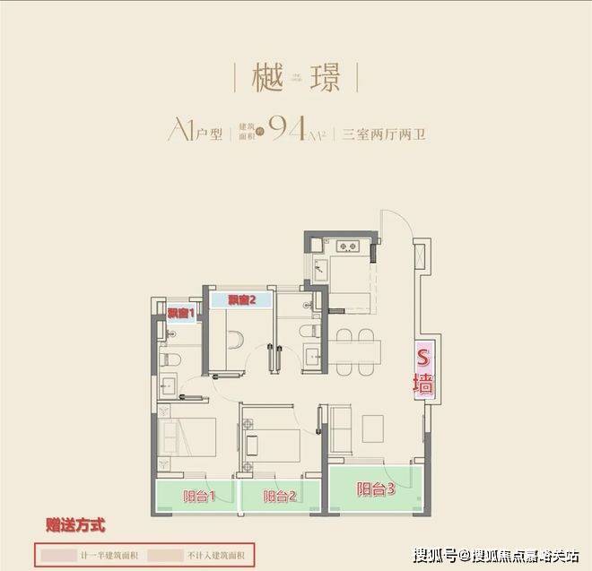 约94㎡起步户型:设计了市场上不多见的南向三阳台,凭借充足(约9%)的赠送面积,实现空间利用率最大化。
