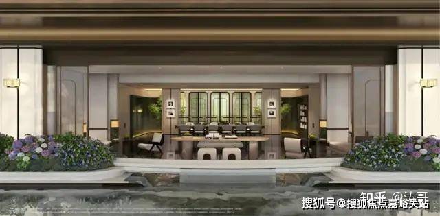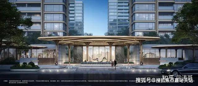 社区门头的设计同样非常有腔调,顶部是大面积弧形金属板,背景是通透玻璃和奢石景墙,对标奢华酒店门庭,营造出豪宅归家仪式感。