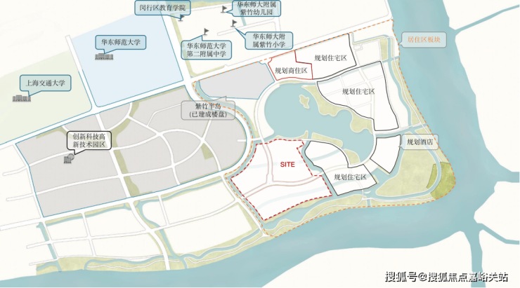 项目西侧是紫竹高新技术园区、 北面是交大和华师大校园,以及紫竹基础教育园区,包含幼儿园至高中全龄段教育配套。