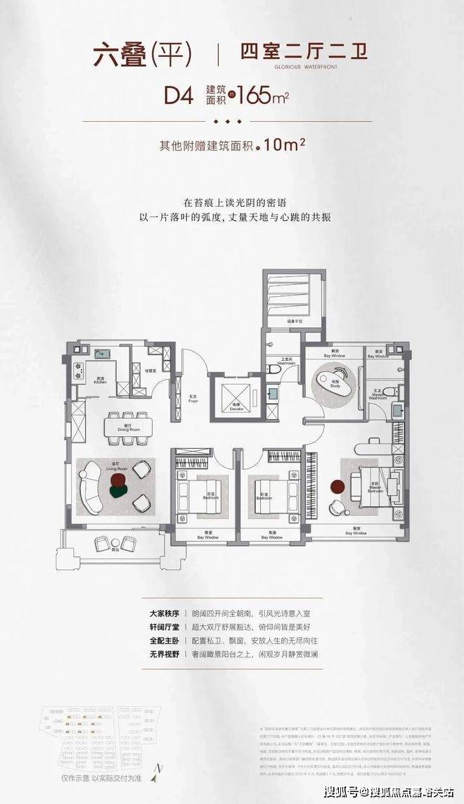 穹顶、柱廊与水法!而以上的这些经典移植,造就了整个象屿天誉蘭香的十大奢艺空间。篇幅有限,所以我们精选几处空间,说明它们如何服务于生活:晴空穹顶:约7米直径的穹顶,其核心价值在于创造了一个共享的、具有凝聚感的社区艺术客厅。无论是归家动线还是社区活动,它都是一个提升归属感的地标。琉森水苑 & 水苑柱廊:50根廊柱构建的回廊,不只是拍照的背景。所有这些设计的最终指向,是为业主提供持续的情绪价值:如此大规模的定制,在整个上海高阶产品中同样也是超前列的存在。虽然是竖厅,但是这个客厅面宽也达到了惊人的约4.5米,尺度感完全不用担心。另外,餐厅两侧均预留餐边柜位置,是两个交付的冰箱位置,增加更多的收纳。南向客厅+次卧双阳台的设计,整个空间尺度感相当宽绰,不管是把他当做是次卧的一部分,还是做一个健身的区域都是很好的选择。边套的南北次卧均是约270°的飘窗,实用性、采光面以及视野都非常惊人。最后,由于项目南面住宅仅4层高。因此,象屿天誉蘭香3-4F南向就可以纵享兰香湖美景!