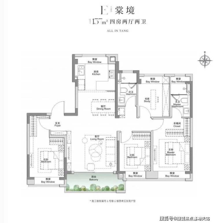 建面约105㎡3房2厅2卫,做到了三开间朝南+4个飘窗+双面阳台系统+主卧套房设计+270°转角飘窗,该户型的居住体验、舒适度、尺度感,是同级别产品所无法比拟的。