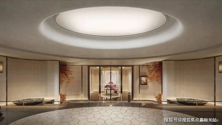 社区大堂极具仪式感,未来会采用地下会所设计,入口采用三重弧形石材墙体+圆角幻彩穿孔顶,夜幕下如流淌的鎏金河流。