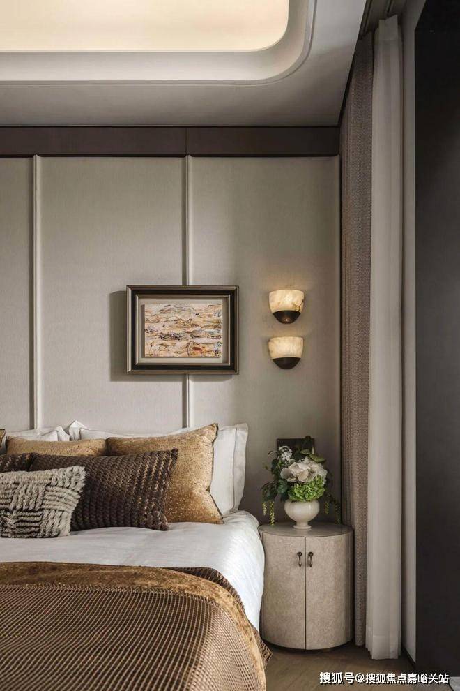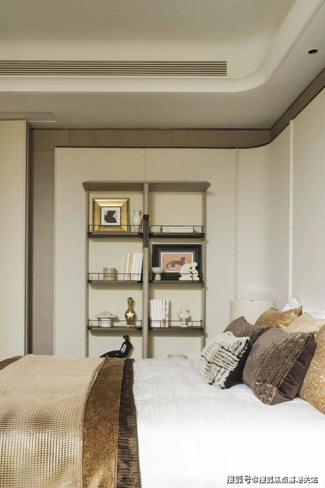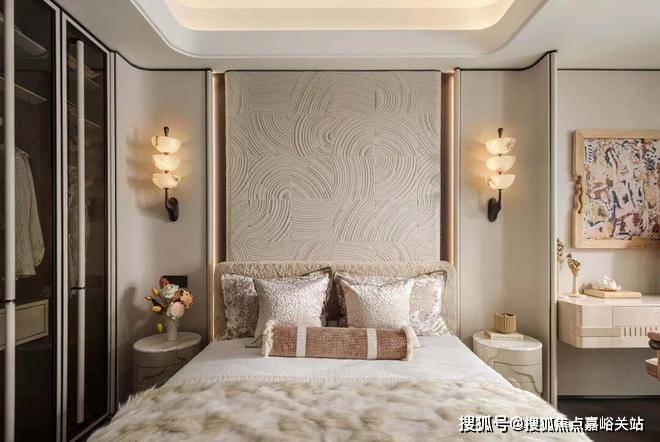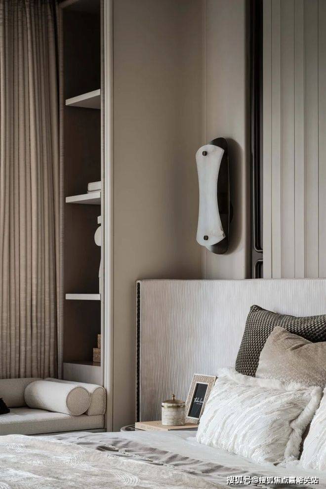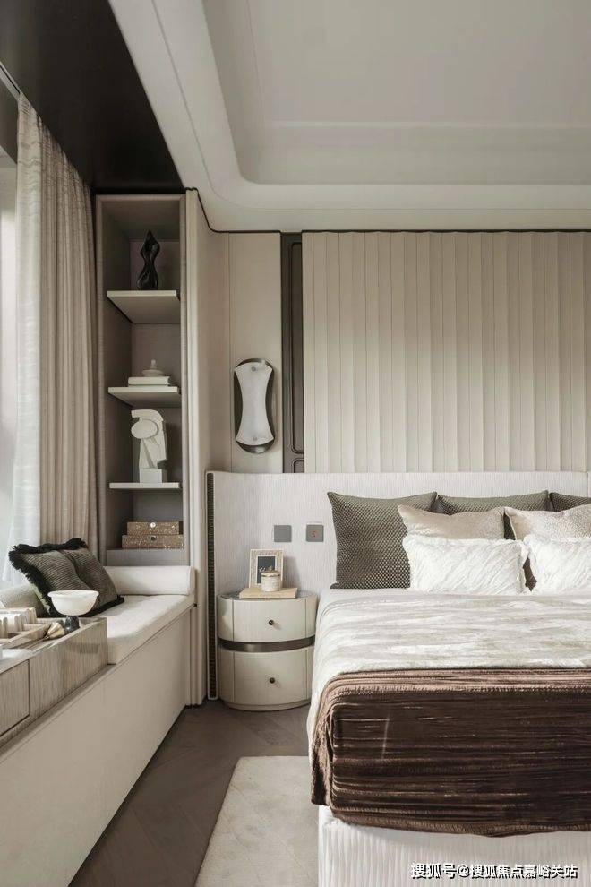 The master bedroom spreads a peaceful poetic atmosphere in symmetry, with warm white leather covering the walls layer by layer with delicate geometric texture, as if the gentle time is layered into the breath of space. By the window, a suspended reading couch is set up by the river - when sitting or lying down, the four seasons flow in all directions.