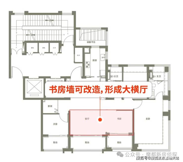 值得一提, 靠近主卧的次卧与客厅之间的墙体可灵动改造 ,若打通则能形成 约38平超大横厅 ,相当于常规180平户型客厅尺度,社交与生活场景随心切换。