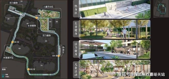 五大运动活力系统:热身区、定制主题儿童活动区、老年健身区、活力健身区和休憩缓冲区,并由约400M跑道串联;