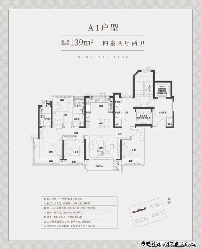 建面约139㎡4房户型,套数不多,但产品力绝对惊艳。四开间朝南,约15.05米宽的南向横厅、约1.6米进深的奢阔阳台,中环顶级享受的既视感。主卧约4.45米的进深,约4米大面宽(含飘窗),中环铂樾售楼处电话:400-8824-258