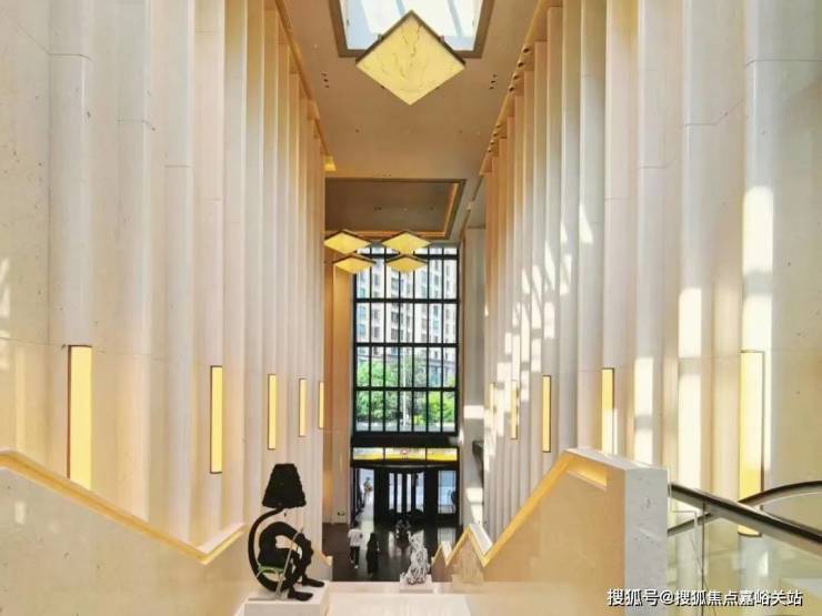 大堂整体挑空14.5米,两侧通体象牙质地色泽的大理石铺面,结合竖向灯带,归家的仪式感被拉满。