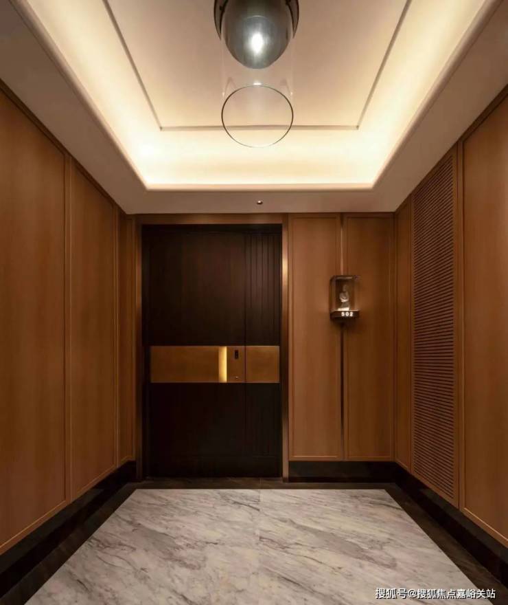 电梯厅的公区,灯光以及材质上都呈现高级和艺术调性,没有很花里胡哨,但却低调奢华,归家的仪式感拉满。