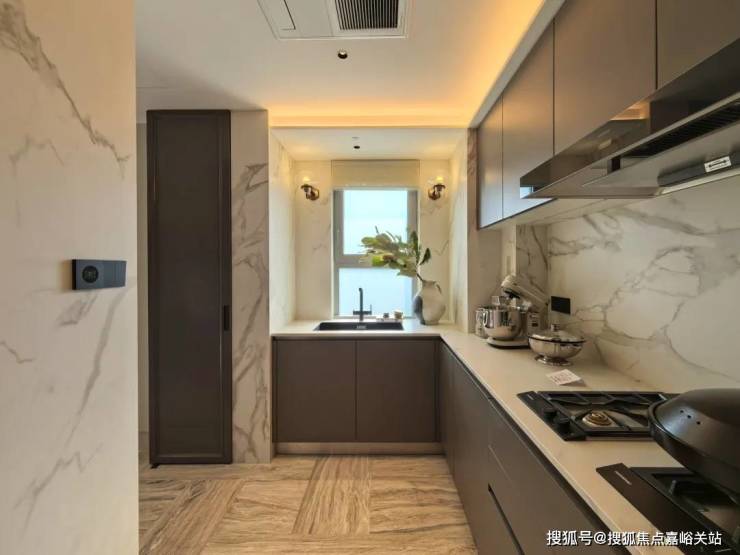 来到厨房,中興傲舍配置嘉格纳高端四件套,中厨用的是铂浪高的花岗岩水槽。