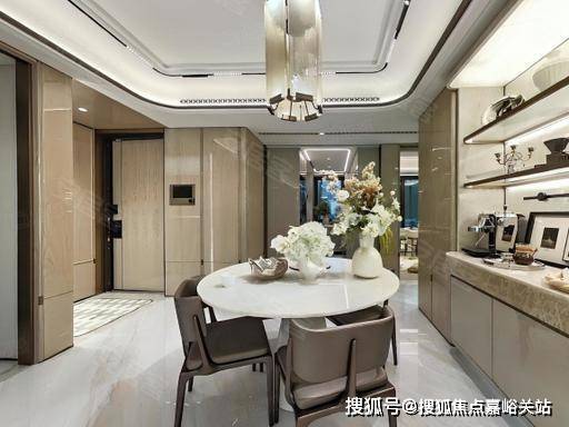 高奢精装标准 层高约 3.15 米,配嘉格纳厨电三件套、博世冰箱、汉斯格雅卫浴、智能马桶、美妆冰箱、全屋木饰面与定制柜。