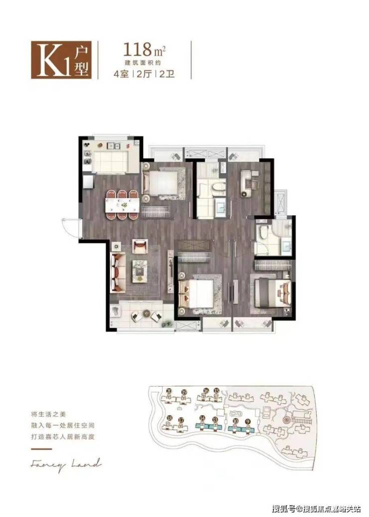 9-10-13-14号楼边套,118㎡4房2厅2卫,总高18层(两梯三户),共144套.