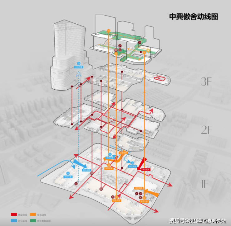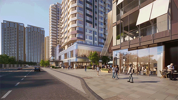 3层或4层以上是住宅 ,项目将住宅整体抬升,围绕归家动线设计了近6100平米的高线公园,搭配首层商业社交型公园,再加上南向直面的约3.5万方中兴公园,形成内外三重景观体系,真正实现“出则繁华,入则静谧”。