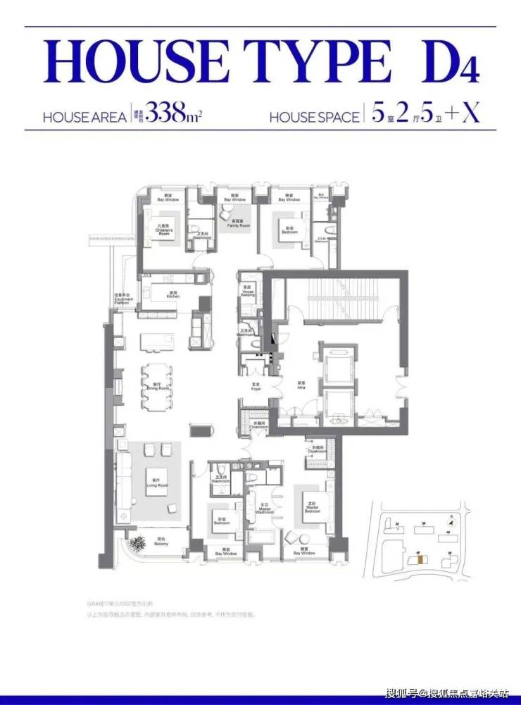 以建筑面积约338㎡户型为例 ,该产品设计了约86㎡超级社交厅,整体面宽约8.45m(含x空间),进深约15.7m,满足高端客群对客厅空间尺度的要求。客餐厅重点公共区域采用大面积 宝格丽蓝奢石 ,搭配静雅棕石材围边,用浅色拼花纹理引导视线并拓宽视觉。