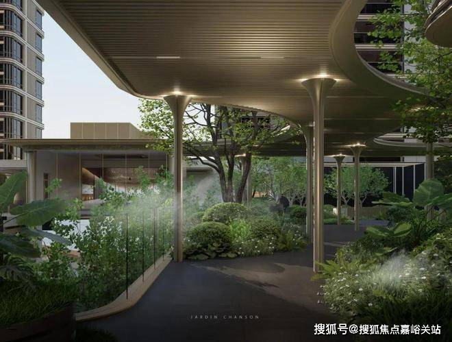 以“浮岛”为核心概念,通过“林岛漫步-循水归岸-闲庭雅致”三重动线,将浦江水岸的奔涌韵律与郊野公园的森氧秘境凝练为可触摸的生态艺术。内部部分风雨连廊连接社区与会所,雨天无需撑伞即可漫步至单元门,细节处尽显奢贵,赋予归家仪式感。