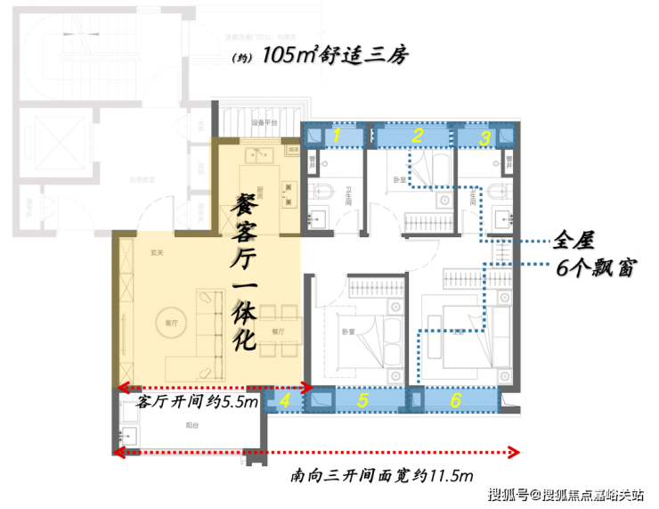 优越的窗墙比,可以最大限度将优美的景观纳入眼帘;南向三开间面宽更是达到了约11.5米,可以说市场同户型面积段产品很难做到这样极致化;功能房间以舒适度为导向服务生活,尺度均做到了当下主流产品水平之上;并且全屋附赠6处飘窗,高附加值令人心动。