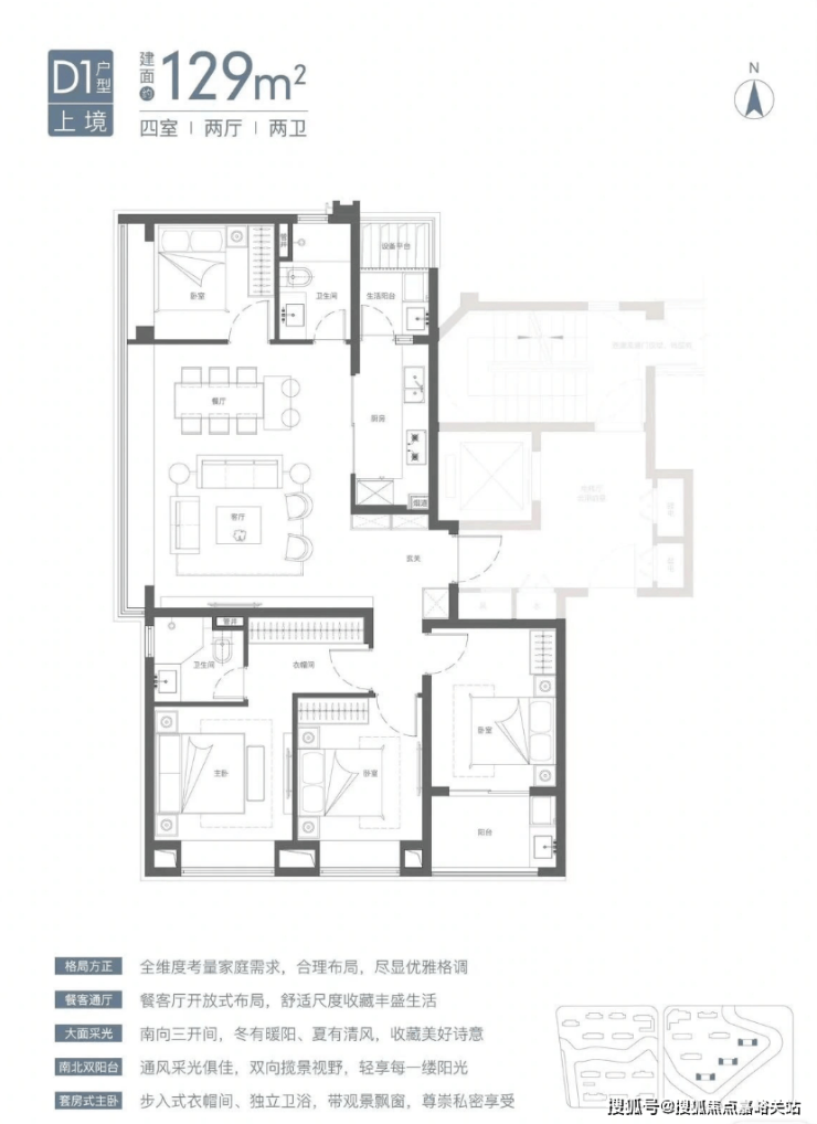 预算充足的小伙伴,可以选建面约129㎡4房,经典的三卧朝南、边套观景户型。