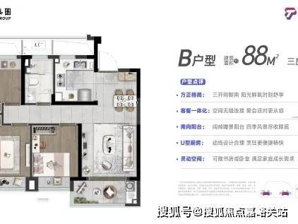 B 户型|88㎡ 3 室 2 厅 1 卫