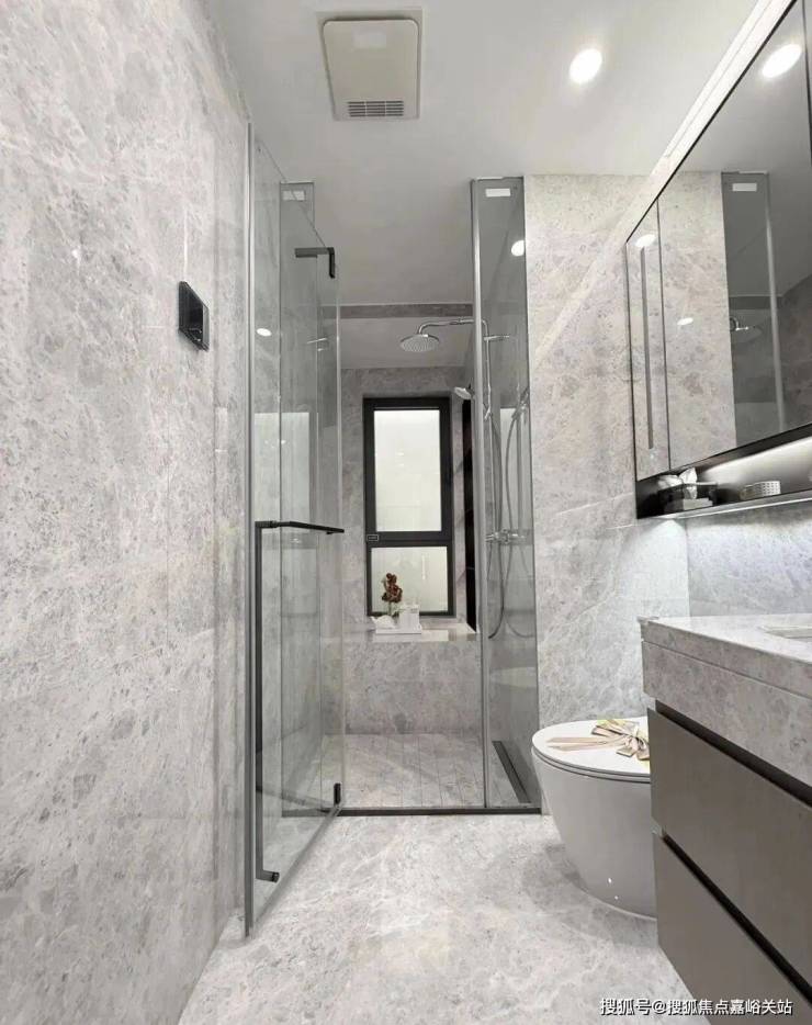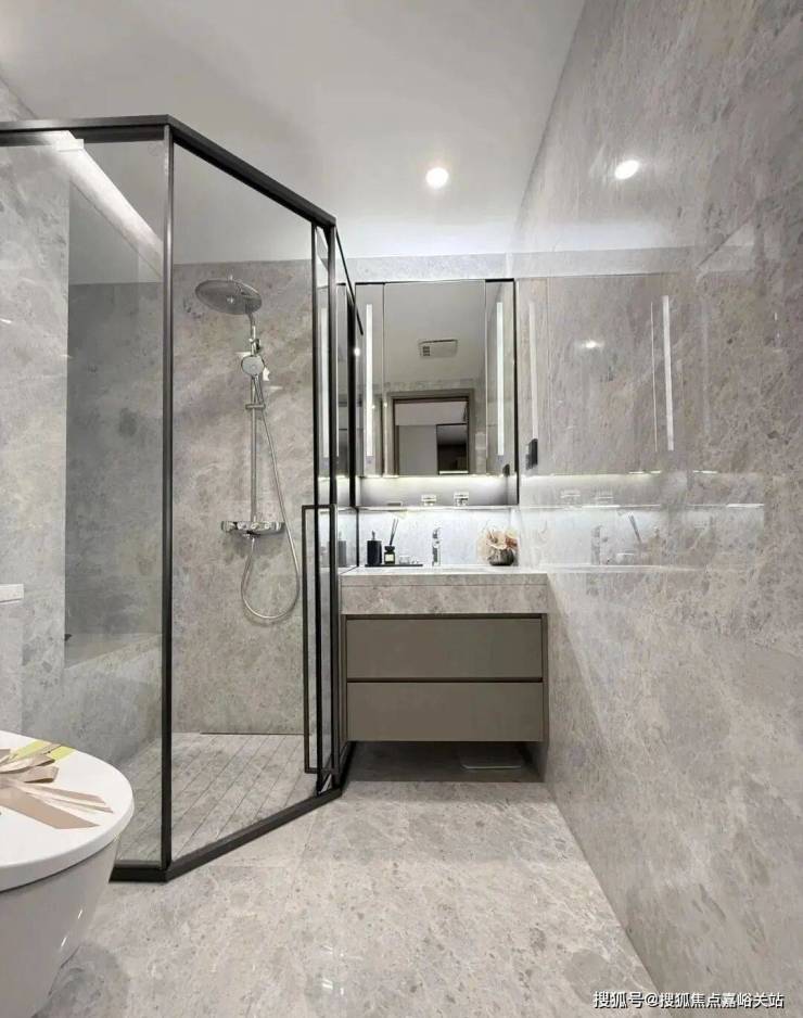 所有户型全屋墙纸交付,连电视机背景墙岩板以及主卧背景墙都是交付标准,卫生间甄选不同的石材,以此来满足功能区的需求。