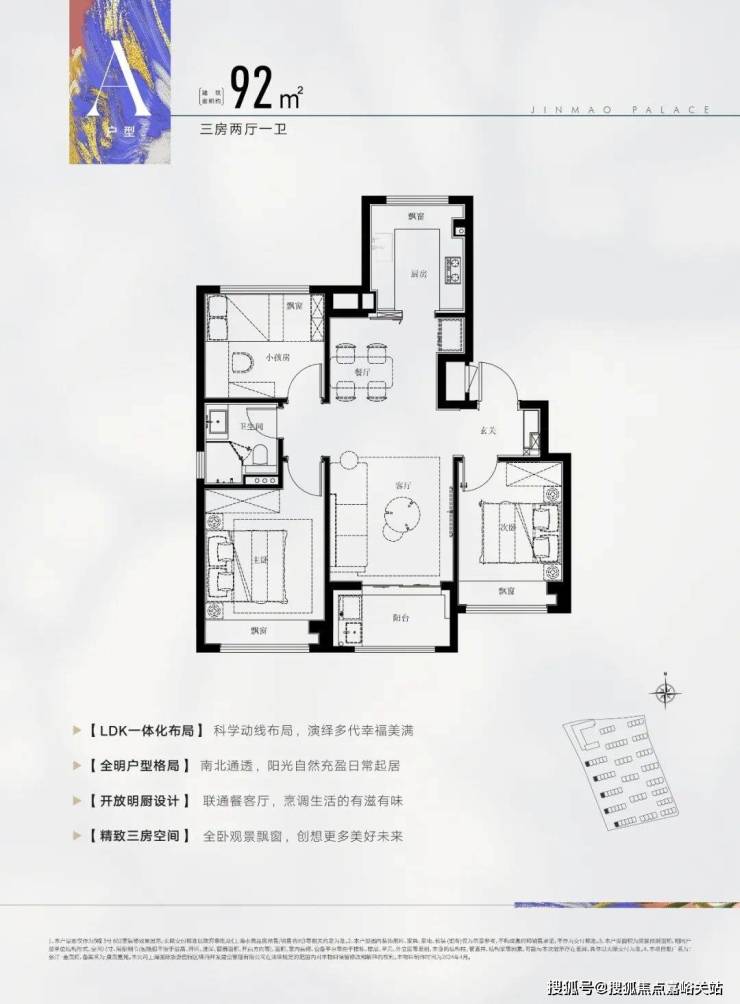 户型三开间朝南、室内 “ 4个飘窗+1阳台 ” ,不管是采光、视野、通风、私密性,还是实用性都十分出色。
