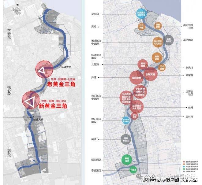 2035年“一江一河”战略明确,黄浦江沿岸将形成两大黄金三角: