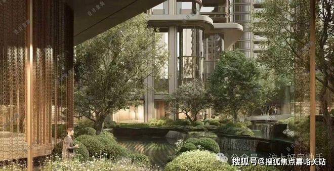三层归家动线从地面景观层到架空层,再到入户层,穿越绿植、光影与水景,步步进入私域。