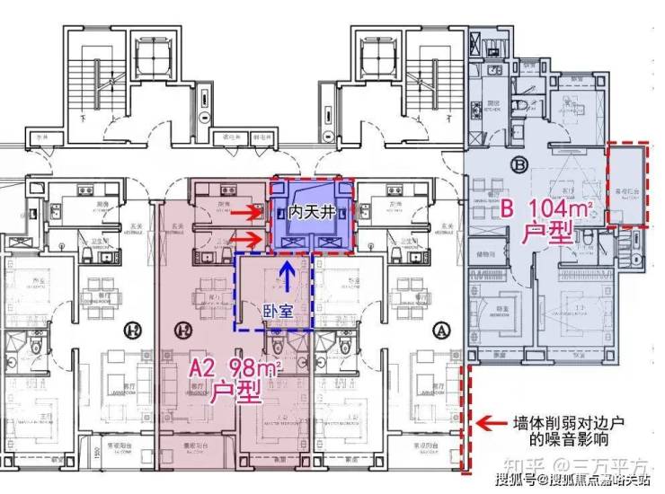 剩余100㎡左右户型中,除东户建面约104㎡的B 户型(3房2厅2卫)由于朝向原因噪音条件相对稍好之外,其余小户型多多少少都有通风采光和噪音方面的硬伤,例如建面约98㎡的A户型(2房2厅2卫),有一间卧室窗户还朝向内天井,在和其他楼盘同面积段户型相比之下,缺乏核心竞争力。这些小户型大概率是不好卖的,要让消费者买单,除非能在价格上做出足够的让步。