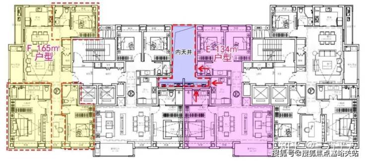 建面约134㎡的E户型(3房2厅2卫),卫生间和厨房都开向T型天井,通风采光性能都较弱,这样的的房间时间长了会有压抑感,居住体验还不如边户122㎡户型。