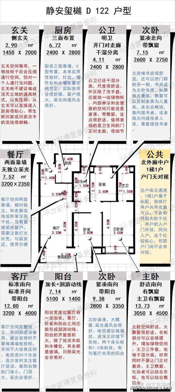 建面约122㎡的D型边户户型(3房2厅2卫),标准南向三开间,加长阳台和数量较多的飘窗配置诚意满满,是楼栋位置、采光、噪音等综合条件最好的户型;后期选房时,如果想购置该房型可能会面临较大的竞争压力。