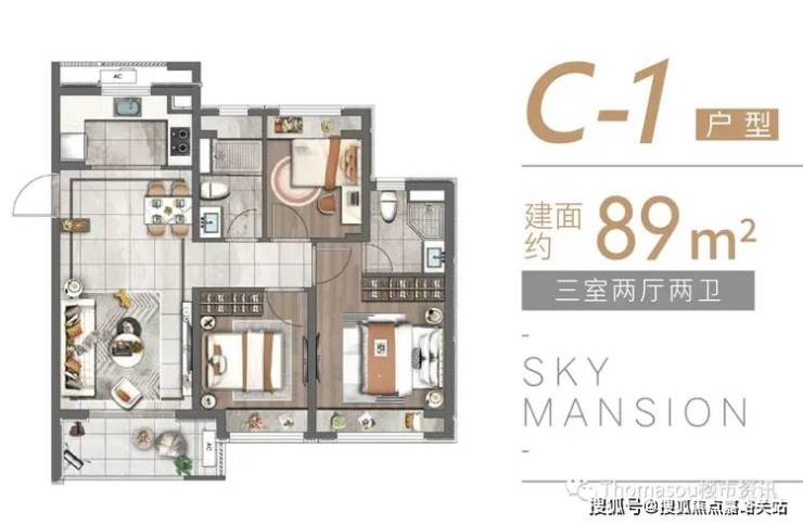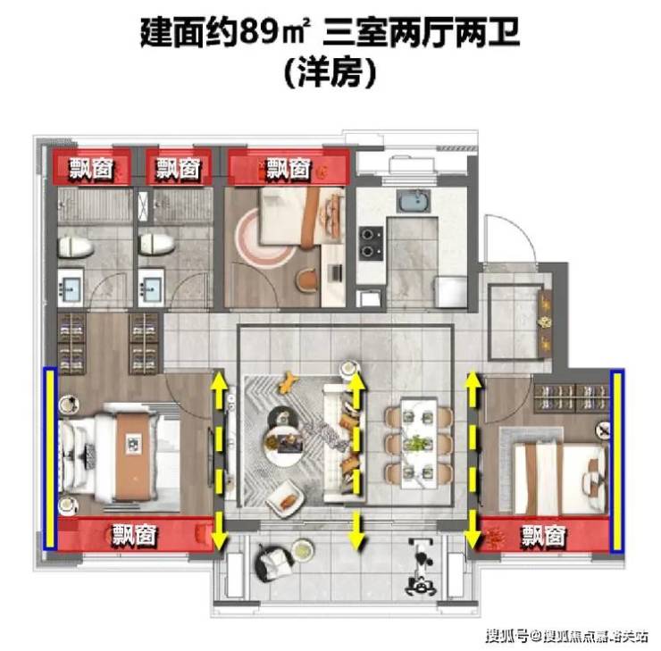 建面约89㎡(三房两厅两卫)