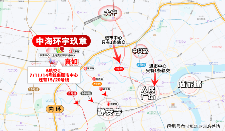 有位从南京西路过来的客户算了笔账:从中海环宇玖章到南京西路仅需5站,他同时在对比中兴路和大宁新房,最后直言“真如的交通效率就是王炸”——4站就能到静安寺,光进市中心的轨交就有三条;而中兴路板块只有8号线,大宁也仅靠1号线支撑,对比之下,真如的交通便捷度无可替代。
