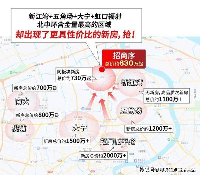一方面,这里是杨浦新江湾、五角场;虹口临平路;静安大宁的下一站,而四大高端豪宅区内的新房门槛大多都在约1200万+,比招商序贵了接近一倍。