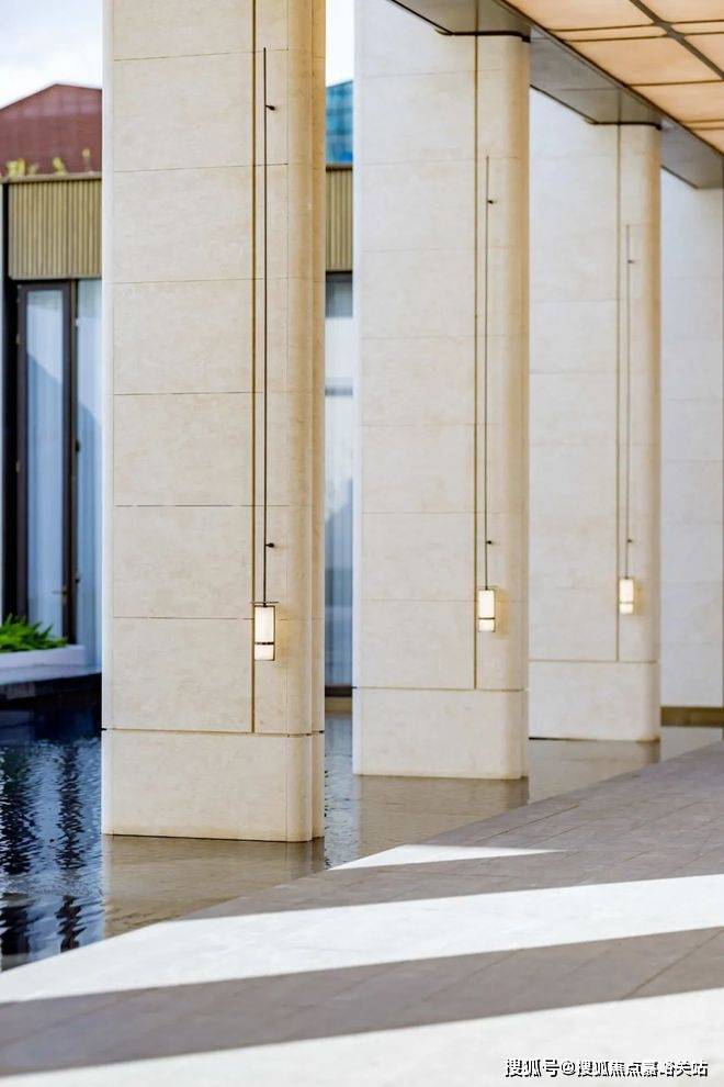 招商序售楼处电话4008569058☑️☑️顶部定制发光云石亚克力与圆弧形的古铜色铝板交相辉映,8个西班牙宫殿沉香米黄石柱提升了尊崇感,漫步其间,揽风入怀,树影斑驳映入眼帘,水声潺潺入耳,归家的轻松感油然而生,笔者随手一拍,都非常的出圈。招商序售楼处电话4008569058☑️☑️