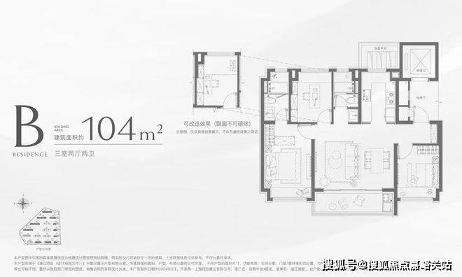 104㎡的户型,采用了大横厅 +270°转角窗设计,南向阔景阳台面宽约5.3米,这样的尺度,在100平出头的面积段极其罕见。另一个南向客卧不管是当成老人房还是客房,都与另外两房做了物理分割,保证了最大程度的舒适度和私密性。