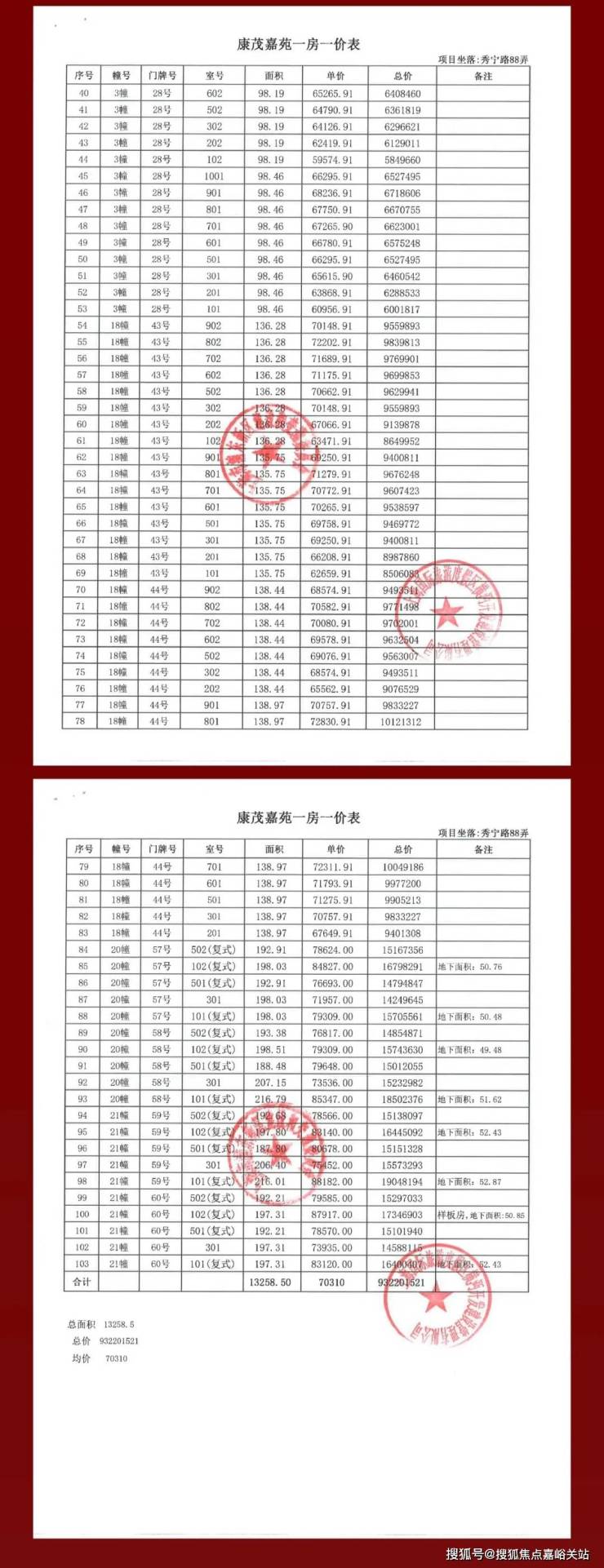 上期一房一价表: