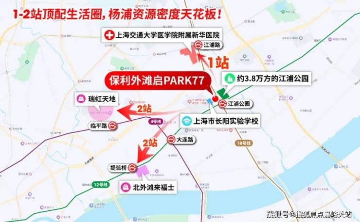 更难得的是, 1-2站范围内,三甲新华医院、北外滩来福士、瑞虹商圈、江浦公园、长阳实验学校等顶配资源一应俱全。