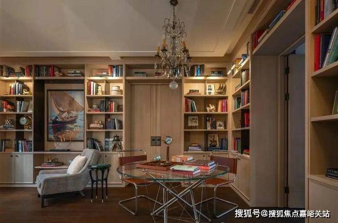 在客厅中,两个展示架巧妙地将空间分隔成主客厅区和休闲室,营造出一个与建筑尺度交相辉映的层次空间。