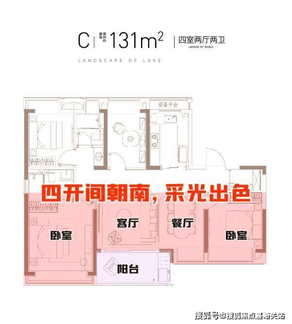 该户型做到了四开间朝南+南北通透+主卧套房设计+全卧室带飘窗+卫生间干湿分离,是一步到位的大4房户型。