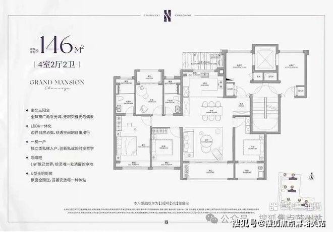 建面约143㎡的4房户型,类一梯一户的设计,每一户都有一个面积约8㎡的独立采光电梯厅空间;四开间朝南+大宽厅,采光效果爆棚;通过LDKB一体化设计,形成一个近50㎡的客餐厅空间,极大提升空间场景的可能性;卧室也采用了酒店化套房设计,主卧贯穿南北套房设计,南北皆有飘窗。