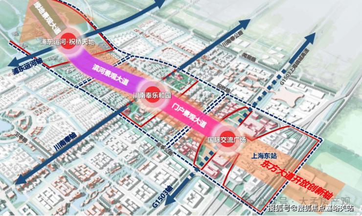 东方大道开放创新轴实现东方枢纽对祝桥镇区及浦东中部腹地的核爆带动效应,推动区域融合发展。东方大道开放创新轴对内打造引领长三角走向国际的新通道,对外打造引领亚太下一个黄金三十年的新桥梁。东方大道整体以中央景观带加双向道路为主,自东站至星光大道约10公里长。