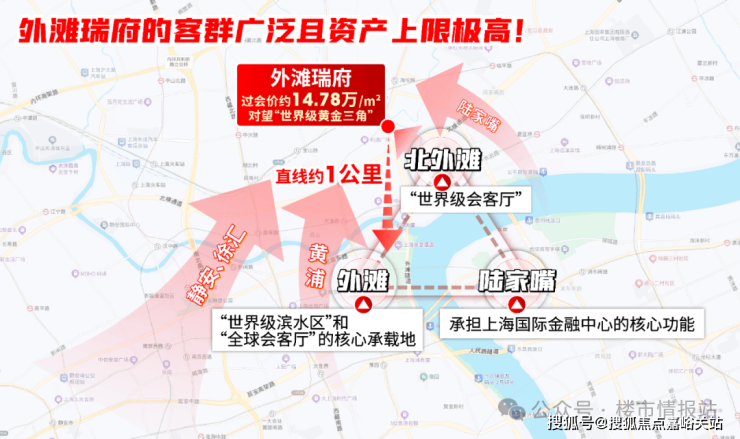其次,在距离外滩1公里范围内,楼盘单价普遍达20万/㎡,只有外滩瑞府给出14.78万/㎡的上车机会。