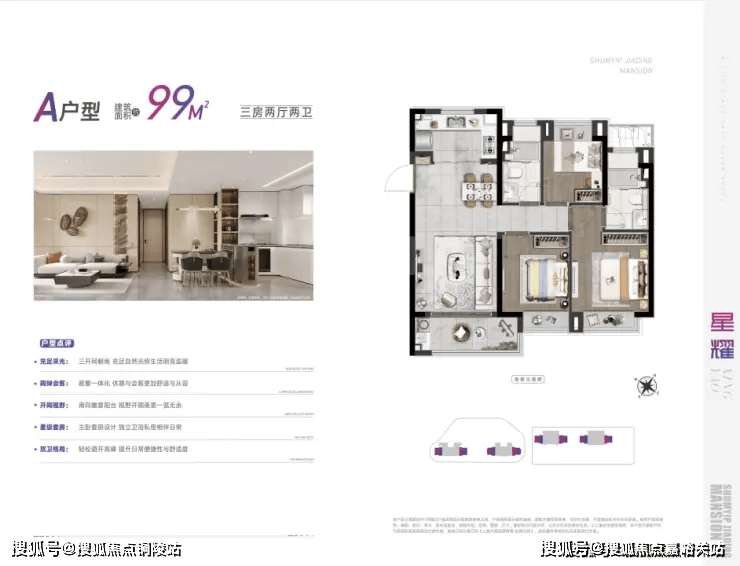 优点:双卫格局提升居住舒适度;户型方正,动静分区合理;得房率更高,实得面积接近市面 105㎡户型。